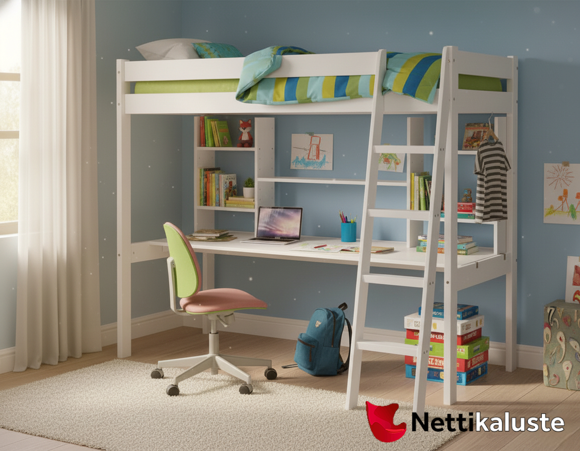 Nukkumatti-parvisänky vapauttaa arvokasta lattiatilaa ja tekee lastenhuoneesta tai pienen yksiön makuutilasta toimivan kokonaisuuden. Korkea rakenne jättää sängyn alle runsaasti vapaata tilaa – siihen on helppo lisätä työtaso, hylly tai pieni oleskelualue. Käytännöllinen ratkaisu, jossa nukkuminen ja työskentely voidaan yhdistää kätevällä tavalla.