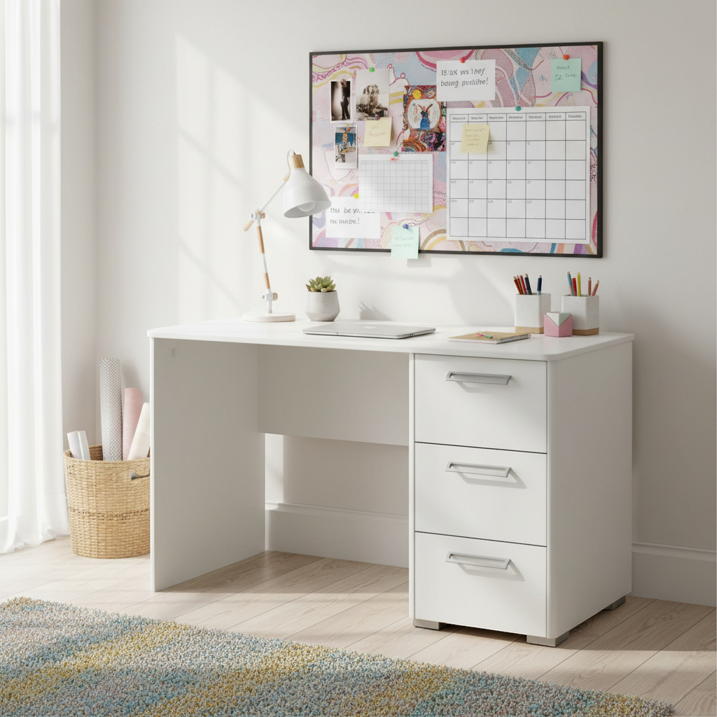 1-osaisessa Helmi kirjoituspöydässä on kolme tilavaa vetolaatikkoa.